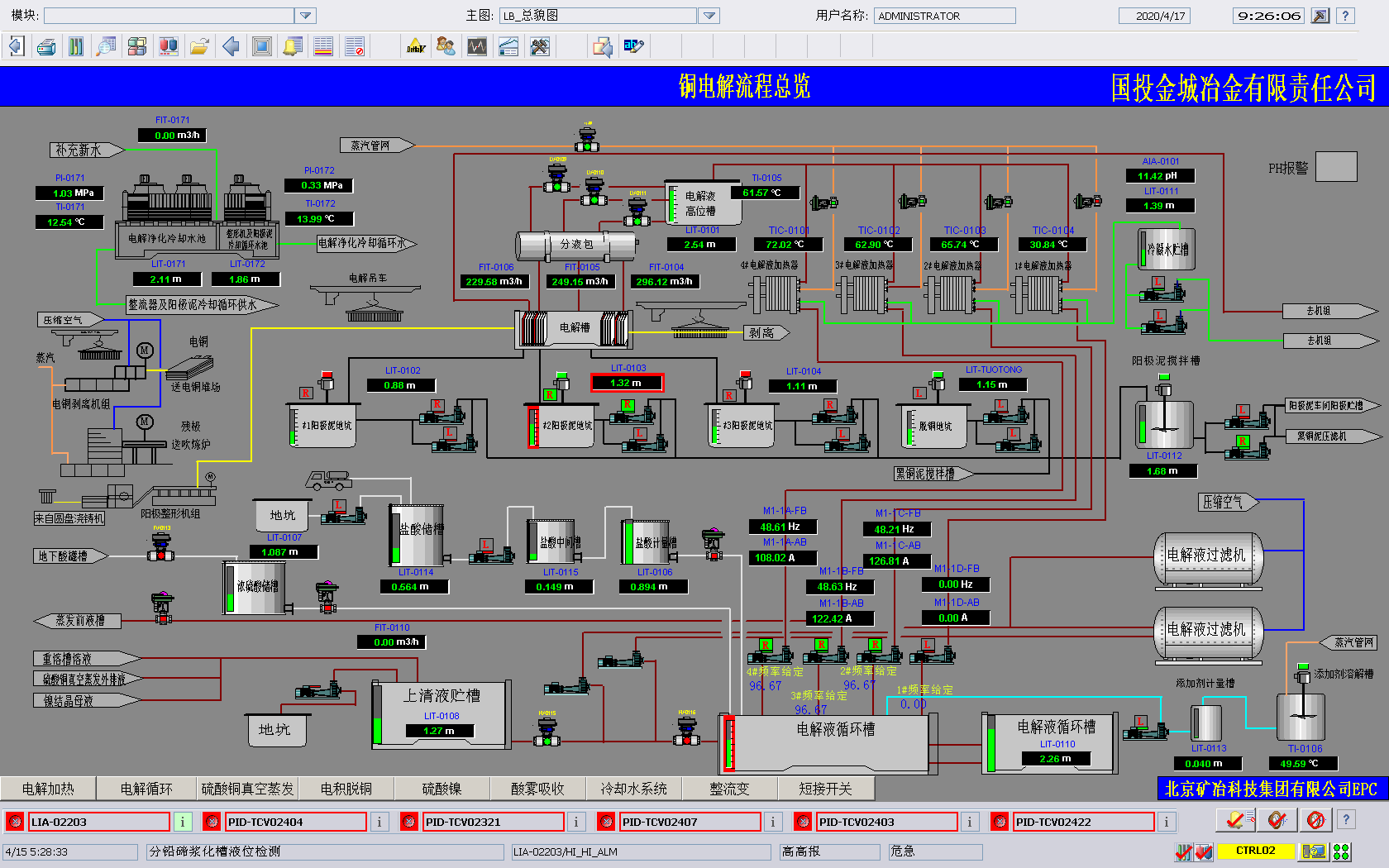 由乐动ledong(中国)总承包的湿法电解区域EPC工程总承包位于河南省灵宝市豫灵镇,生产流程为火法冶炼产出的粗铜,经过电解精炼产出精铜,阳极泥湿法综合回收贵金属。该工程包括电解车间和阳极泥处理车间,两车间相互独立,各设置一套DCS控制系统,均采用冗余控制器+工程师站+操作员站的架构,通过环网联通整个系统。采集的实时生产数据集中归档,并设置一台OPC客户端用于和全厂生产信息管理系统联网,实现全厂资源统一管理。DCS系统针对电解车间电解液加热调节阀频繁,设计带蒸汽压力前馈的PID温度调节,针对添加剂槽蒸汽大,重新设计仪表测量系统,稳定投料速度,减少表面凸瘤和粒子的产生。集成阳极整型机组、天车定位、电解槽短接开关系统、电解液循环过滤系统、阴极剥离机组、残极洗涤机组、真空蒸发机组等子系统,集中显示调配关联数据,方便工艺监控生产过程。
