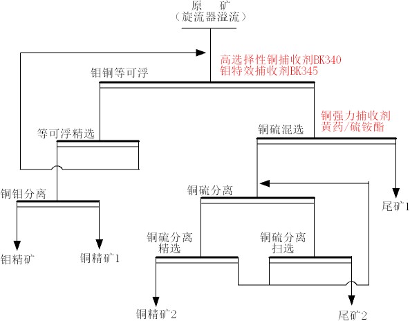 采用该工艺技术,在全球首次实现钼品位0.006%的超贫伴生钼资源综合回收,并大幅改善伴生贵金属的回收指标。通过靶性绿色铜、钼捕收剂AP、BK340、BK404B、BK404C开发,实现浮选过程矿物走向的定向调控,解决了多矿相铜资源的回收难题,铜回收率提高5个百分点以上;通过双官能团协同捕收剂BK345开发,兼顾捕收剂在辉钼矿非极性面与极性棱的吸附,大幅改善了细粒辉钼矿的浮选指标;通过低毒铜钼分离抑制剂BK511的开发,铜钼分离硫化钠用量降低30%以上,环保效益显著。该工艺技术适用于低品位斑岩型铜钼矿、复杂多矿体铜钼矿等复杂铜钼矿的高效开发利用。